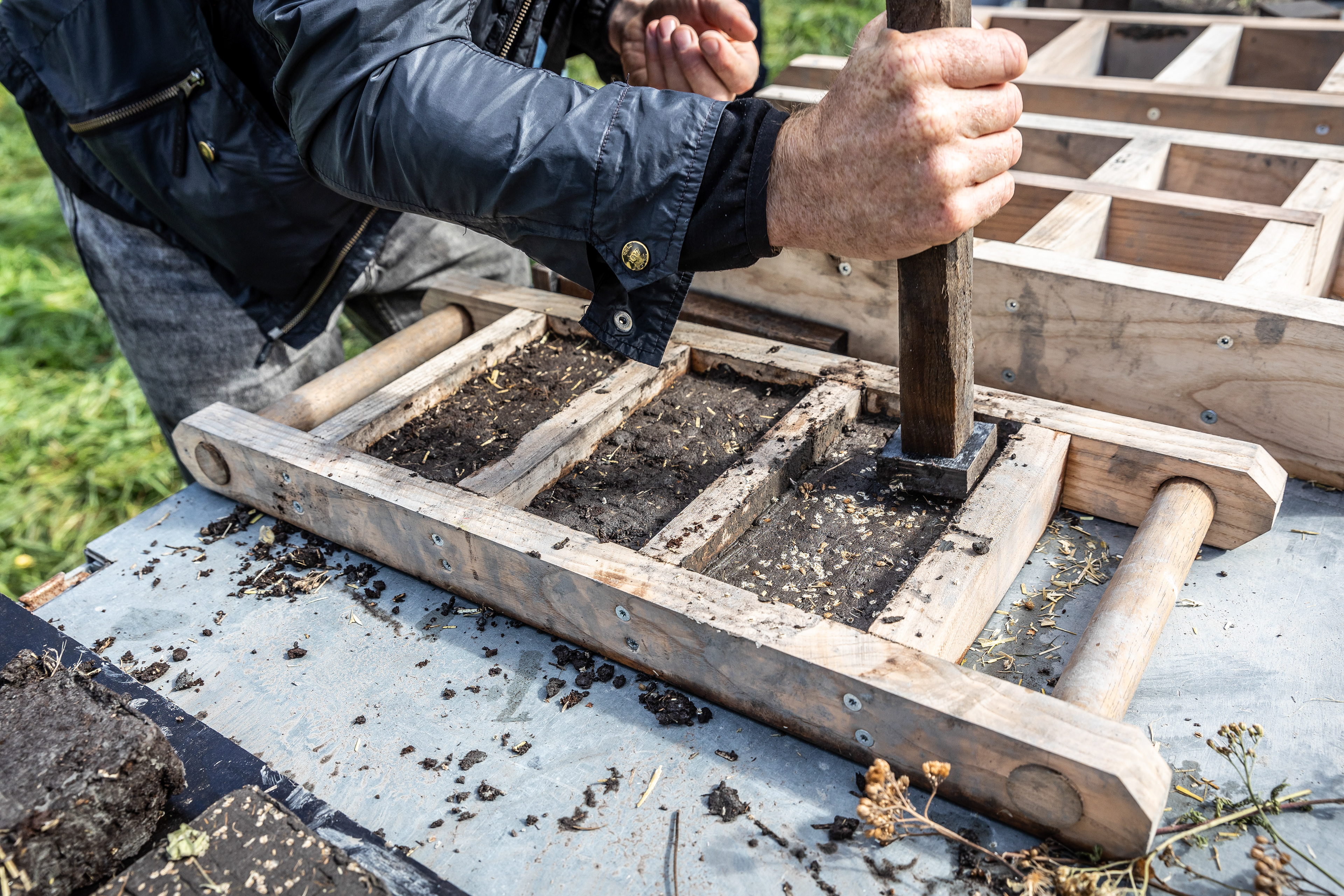 In a first workshop, we worked with handmade rammed earth stones made from clay from the forest. This clay is mixed with humus and local seeds from the seed bank of the Jac. P. Thijssepark.